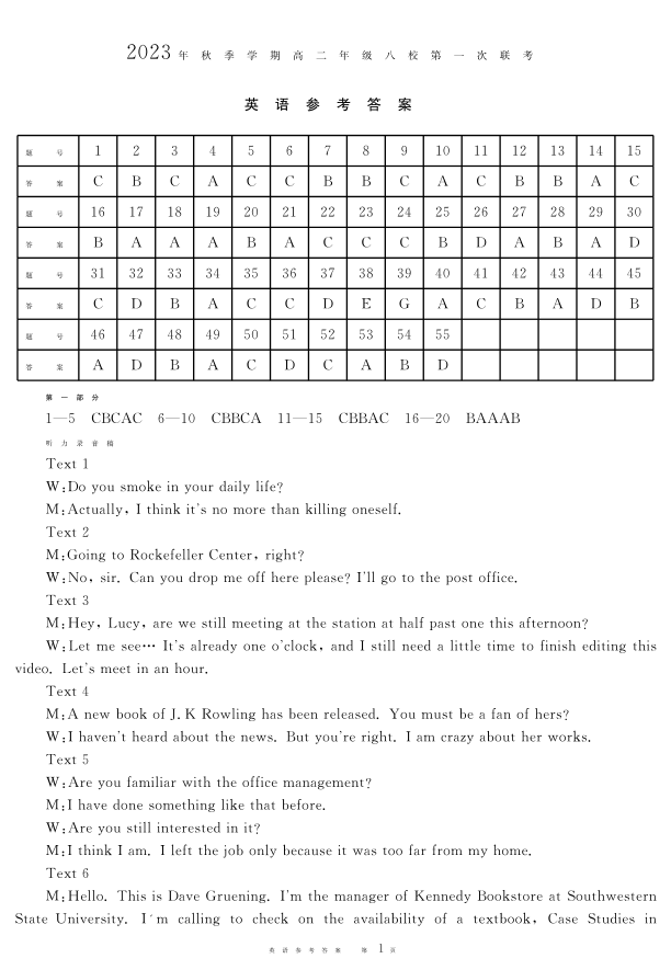 广西壮族自治区河池市八校联考2023-2024学年高二上学期10月月考英语答案