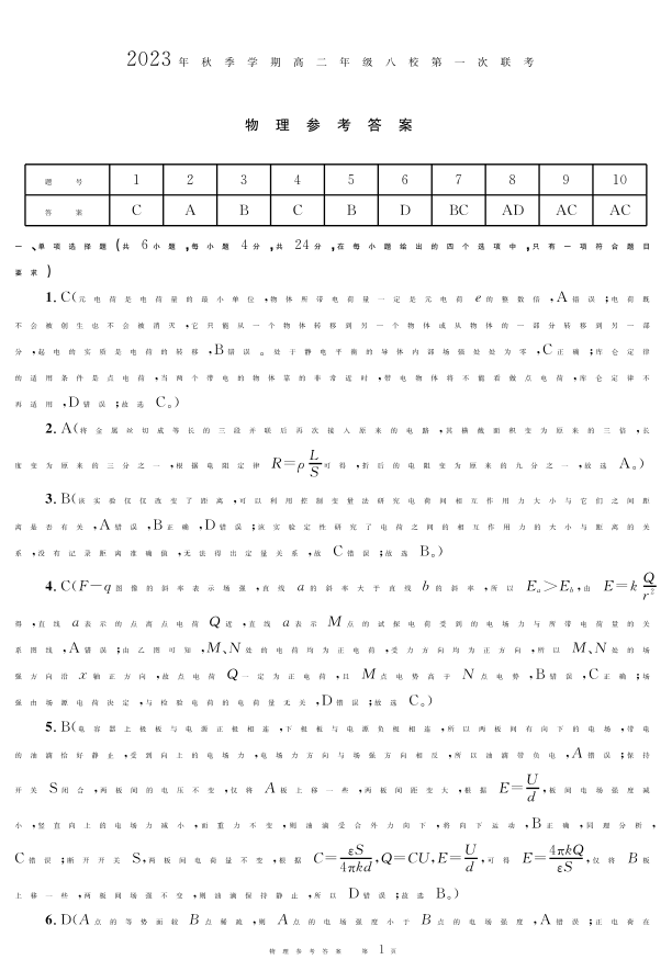 广西壮族自治区河池市八校联考2023-2024学年高二上学期10月月考物理答案