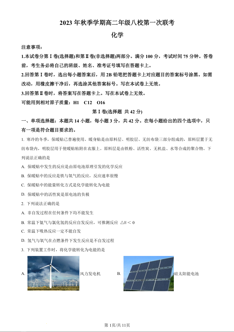 广西壮族自治区河池市八校联考2023-2024学年高二上学期10月月考化学(原卷版)