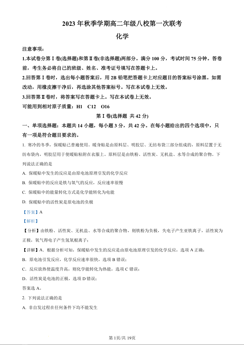 广西壮族自治区河池市八校联考2023-2024学年高二上学期10月月考化学(精品解析版)