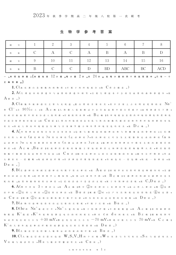 广西壮族自治区河池市八校联考2023-2024学年高二上学期10月月考生物答案