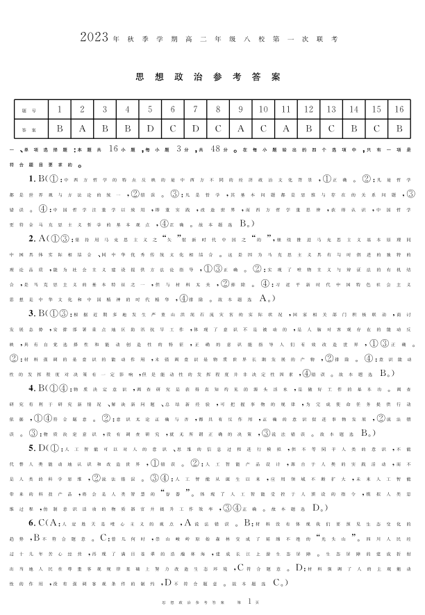 广西壮族自治区河池市八校联考2023-2024学年高二上学期10月月考政治答案