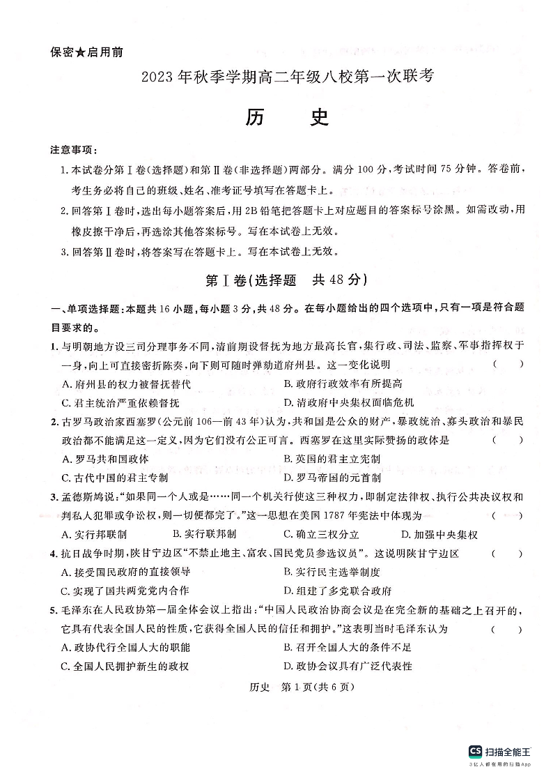 广西壮族自治区河池市八校联考2023-2024学年高二上学期10月月考历史
