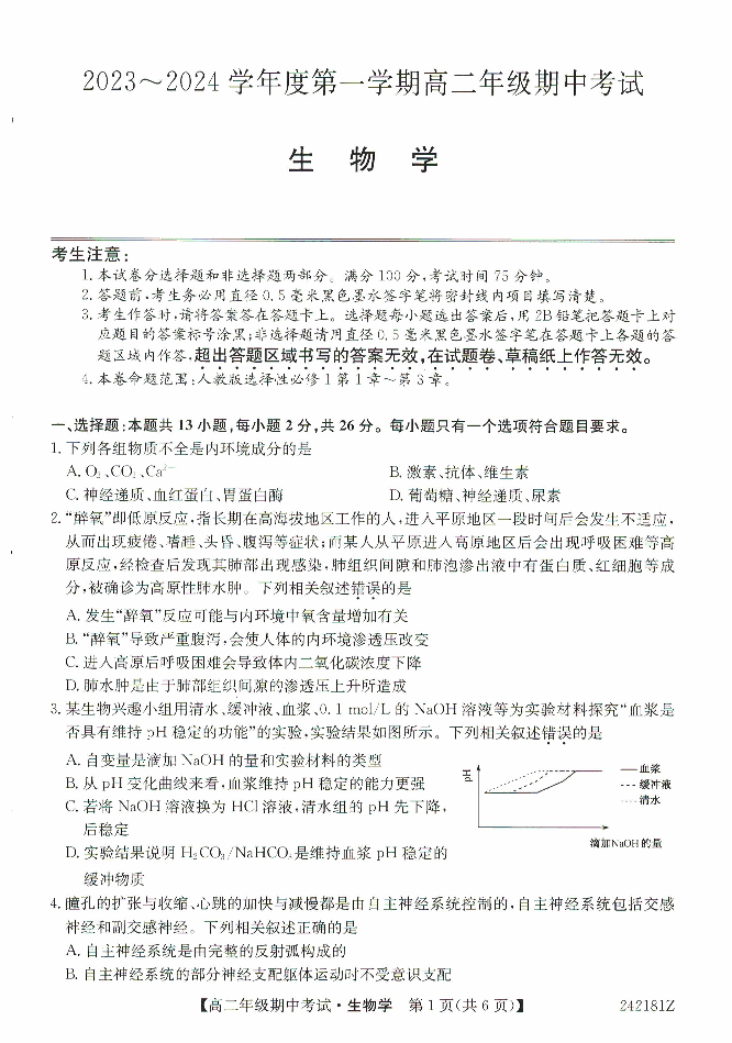 河北省沧州市运东七县2023-2024学年高二上学期期中联考生物+答案