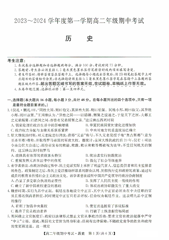 河北省沧州市运东七县2023-2024学年高二上学期期中联考历史+答案