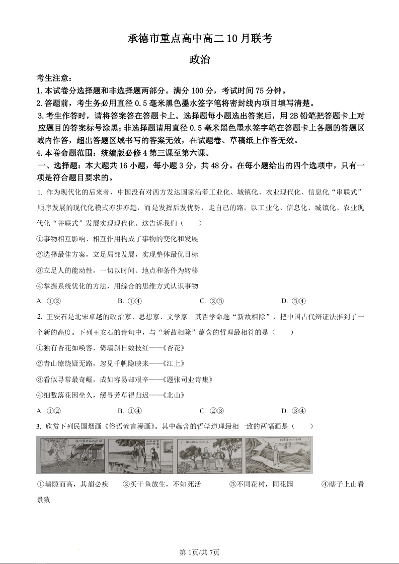 河北省承德市重点高中2023-2024学年高二10月联考政治(原卷版)