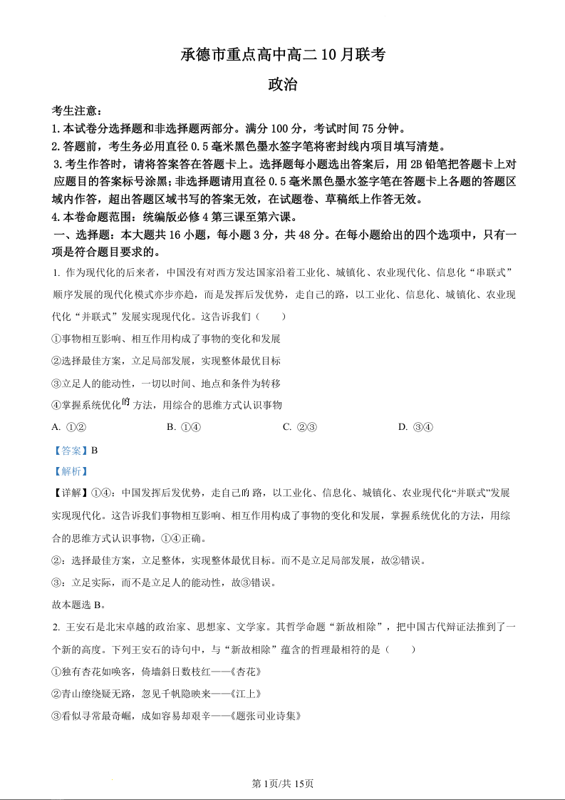 河北省承德市重点高中2023-2024学年高二10月联考政治(精品解析版)