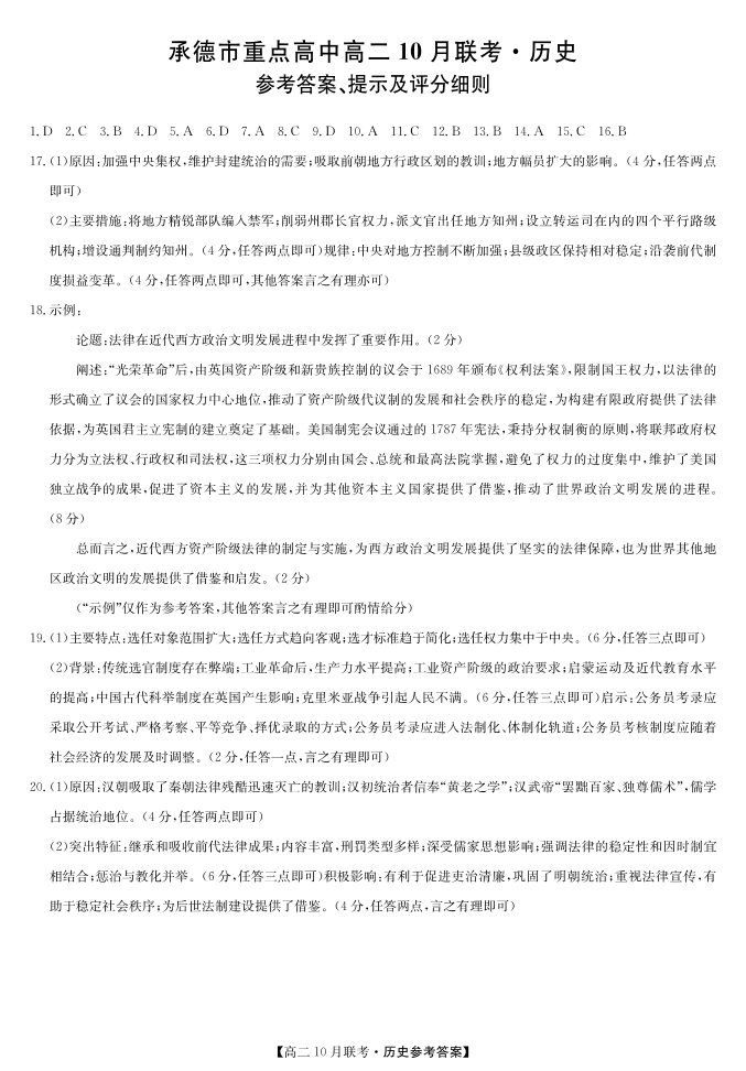 河北省承德市重点高中2023-2024学年高二10月联考历史答案