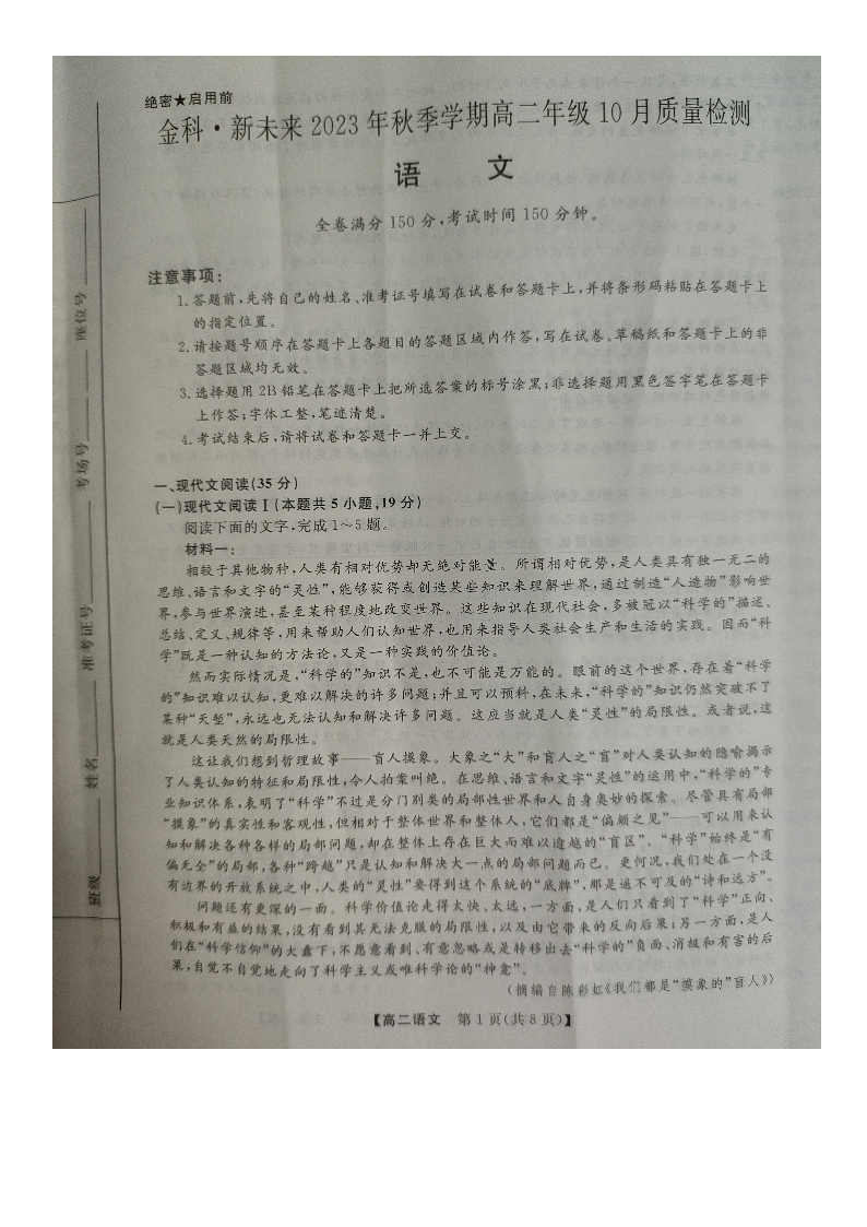 河南省金科新未来2023-2024学年高二上学期10月质量检测试题语文