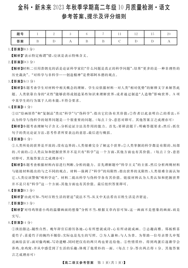 河南省金科新未来2023-2024学年高二上学期10月质量检测试题语文答案