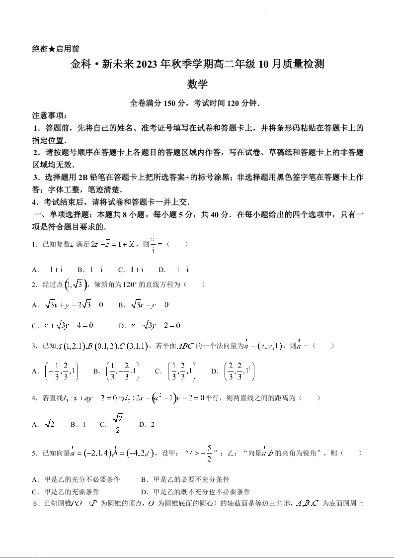 河南省金科新未来2023-2024学年高二上学期10月质量检测试题数学+答案