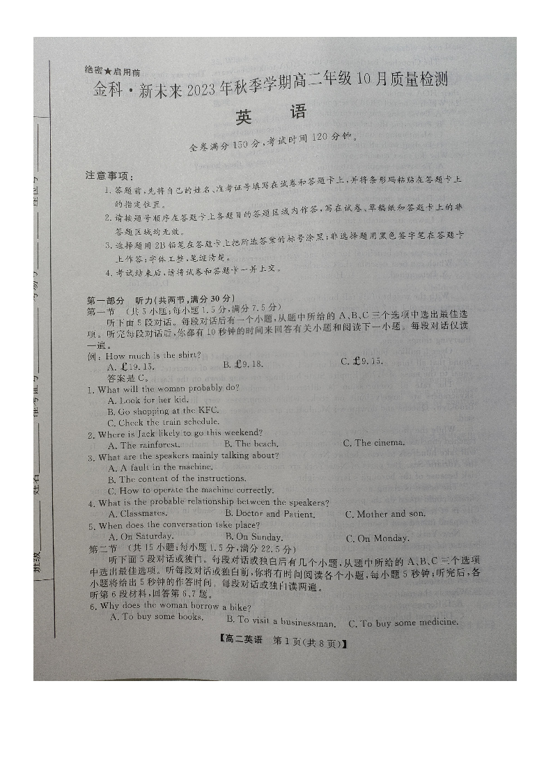 河南省金科新未来2023-2024学年高二上学期10月质量检测试题英语