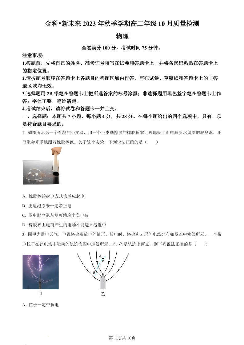 河南省金科新未来2023-2024学年高二上学期10月质量检测试题物理+答案