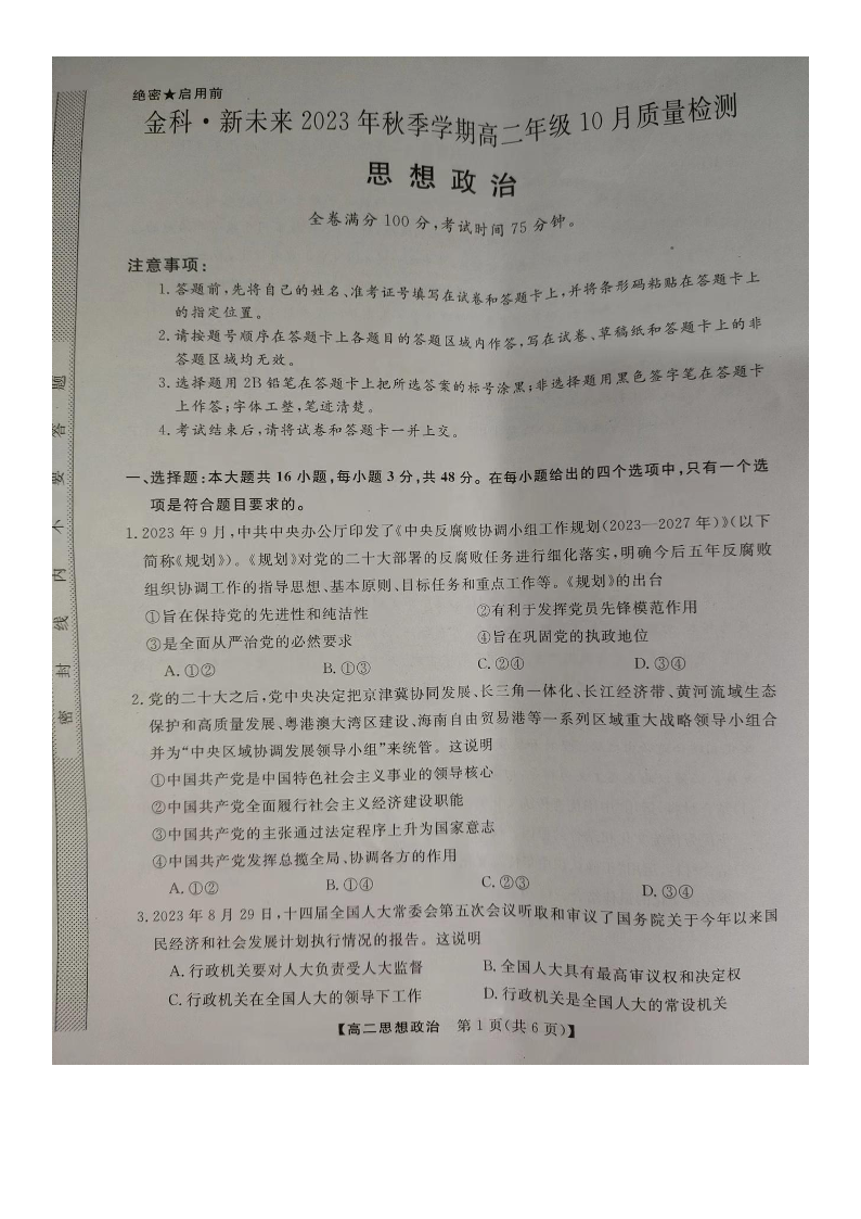 河南省金科新未来2023-2024学年高二上学期10月质量检测试题政治
