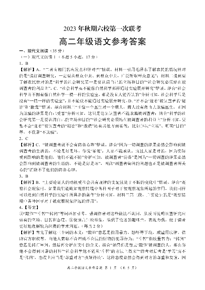 河南省南阳市六校2023-2024学年高二上学期10月联考 语文答案