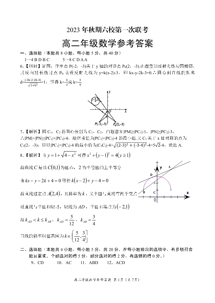 河南省南阳市六校2023-2024学年高二上学期10月联考 数学答案
