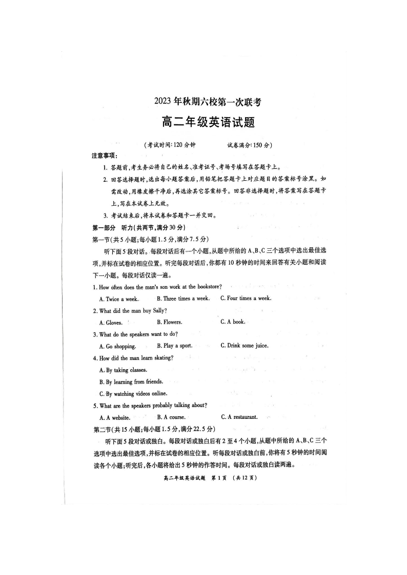 河南省南阳市六校2023-2024学年高二上学期10月联考 英语