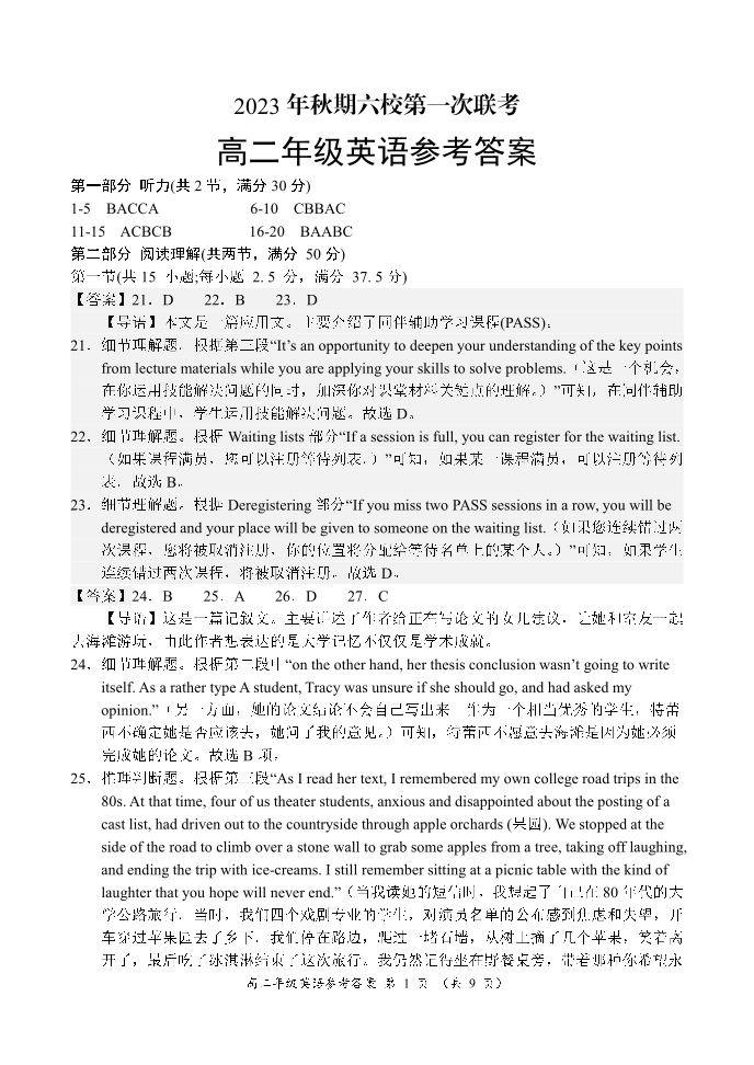 河南省南阳市六校2023-2024学年高二上学期10月联考 英语答案