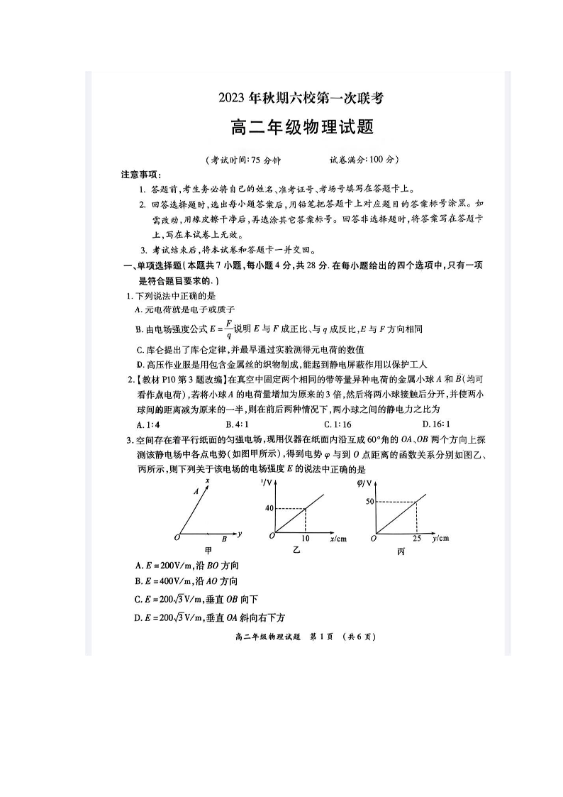 河南省南阳市六校2023-2024学年高二上学期10月联考 物理