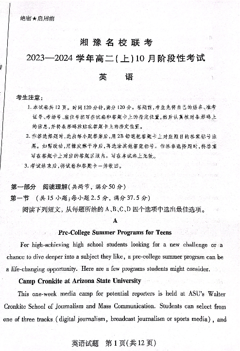 河南省湘豫名校2023-2024学年高二上学期10月联考试题英语