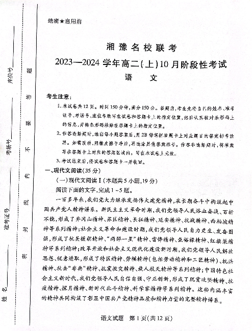 河南省湘豫名校2023-2024学年高二上学期10月联考试题语文