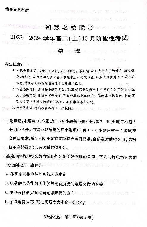 河南省湘豫名校2023-2024学年高二上学期10月联考试题物理