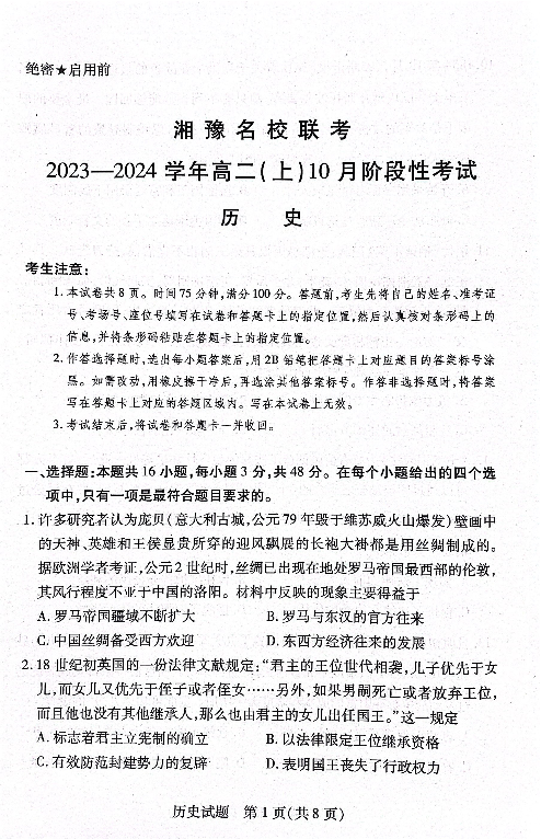 河南省湘豫名校2023-2024学年高二上学期10月联考试题历史
