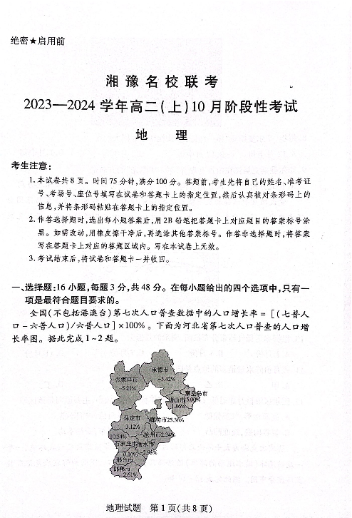 河南省湘豫名校2023-2024学年高二上学期10月联考试题地理