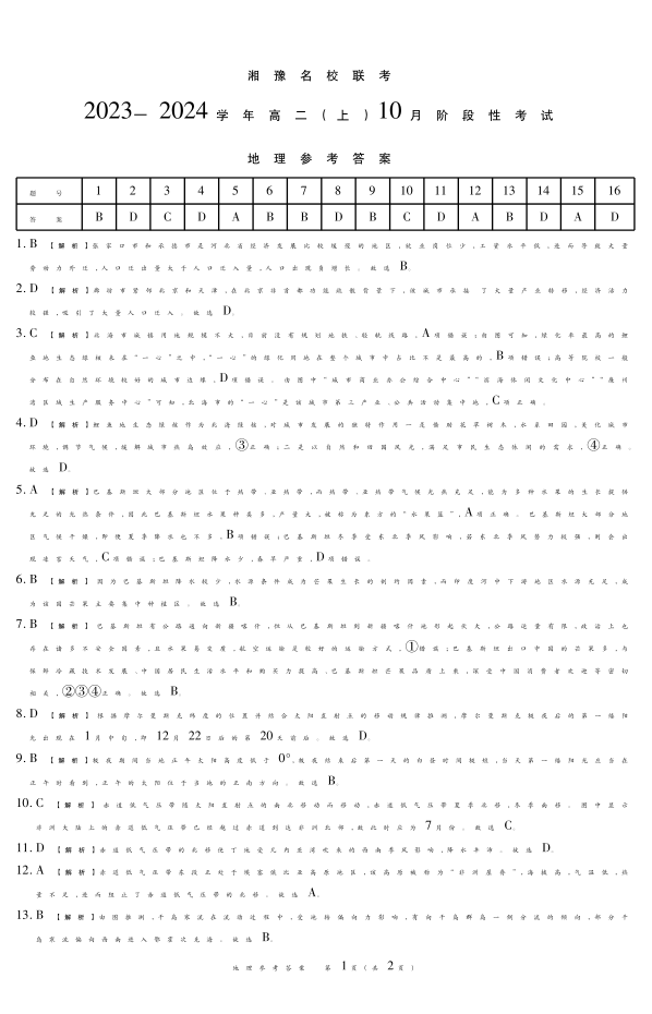 河南省湘豫名校2023-2024学年高二上学期10月联考试题地理答案