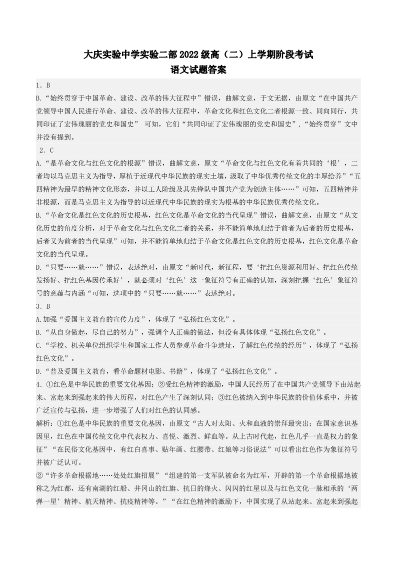 黑龙江省大庆实验中学二部2023-2024学年高二上学期10月阶段性考试语文答案