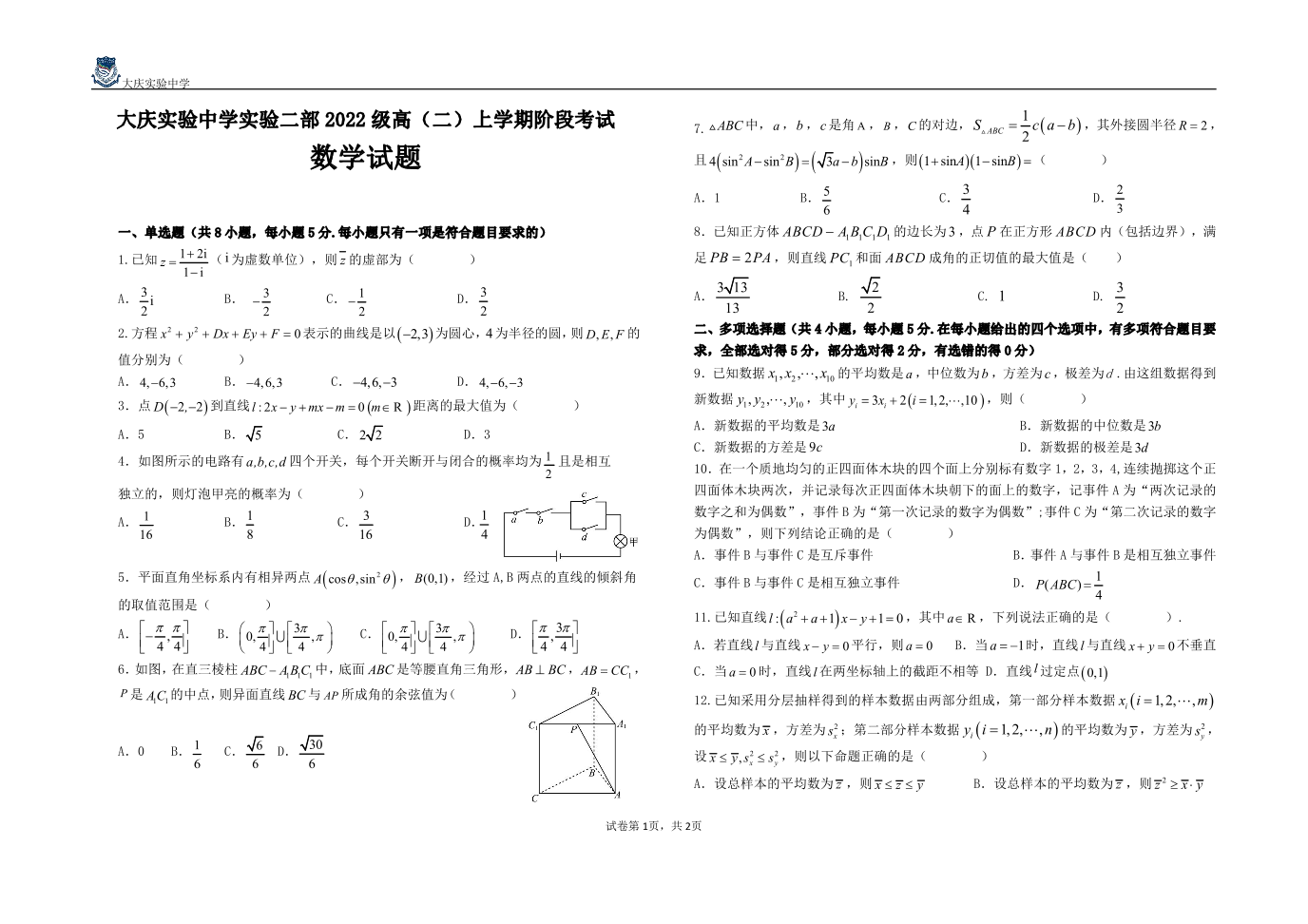 黑龙江省大庆实验中学二部2023-2024学年高二上学期10月阶段性考试数学(原卷版)