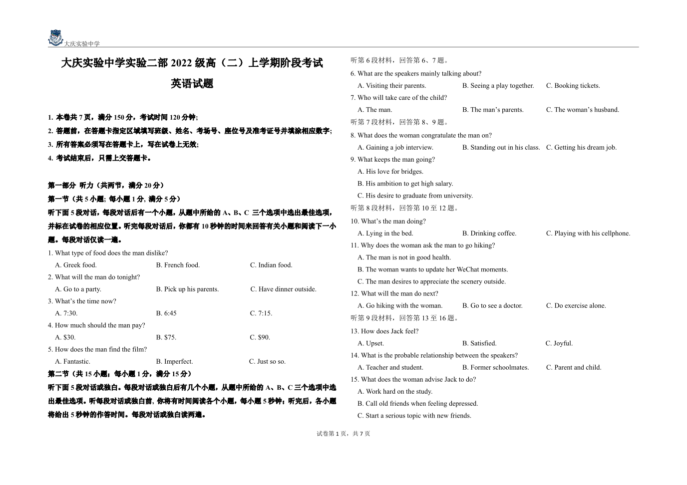黑龙江省大庆实验中学二部2023-2024学年高二上学期10月阶段性考试英语