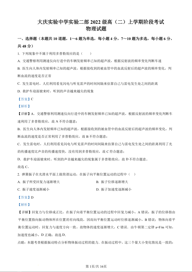 黑龙江省大庆实验中学二部2023-2024学年高二上学期10月阶段性考试物理(精品解析版)