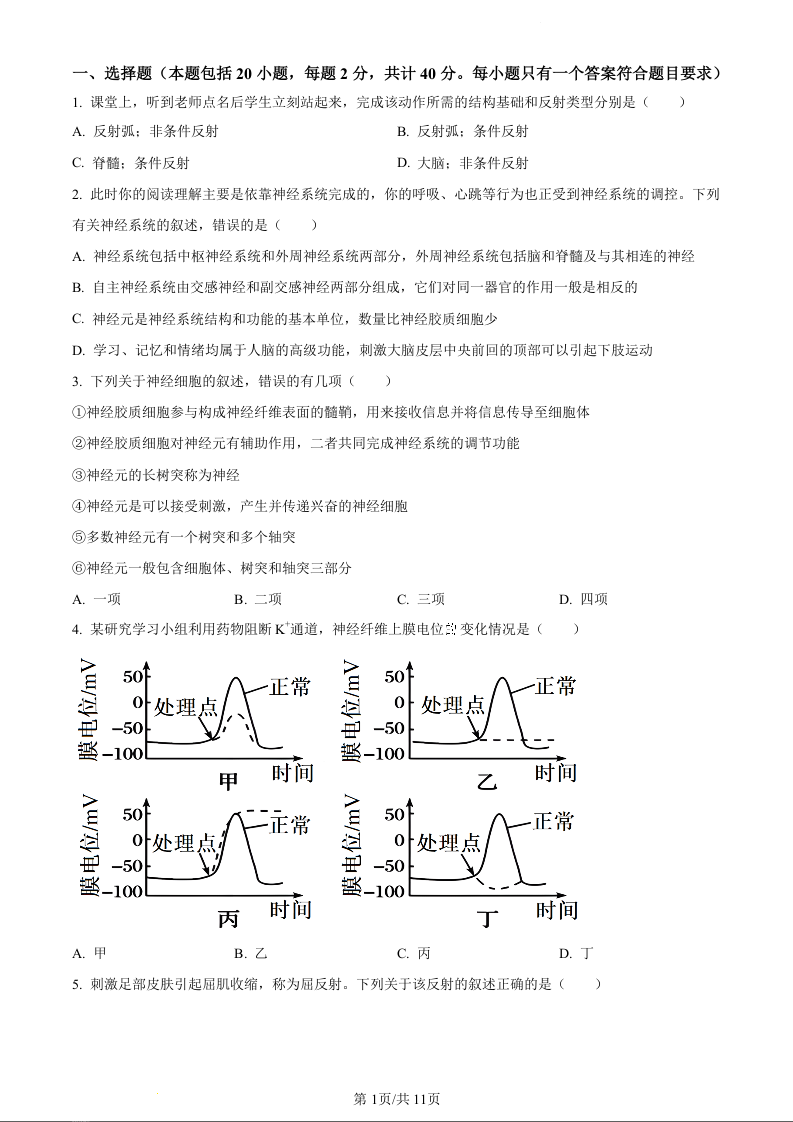 黑龙江省大庆实验中学二部2023-2024学年高二上学期10月阶段性考试生物(原卷版)