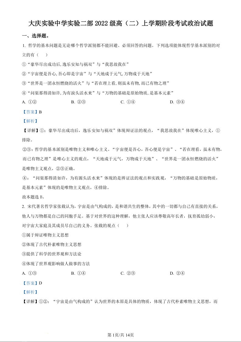 黑龙江省大庆实验中学二部2023-2024学年高二上学期10月阶段性考试政治(精品解析版)