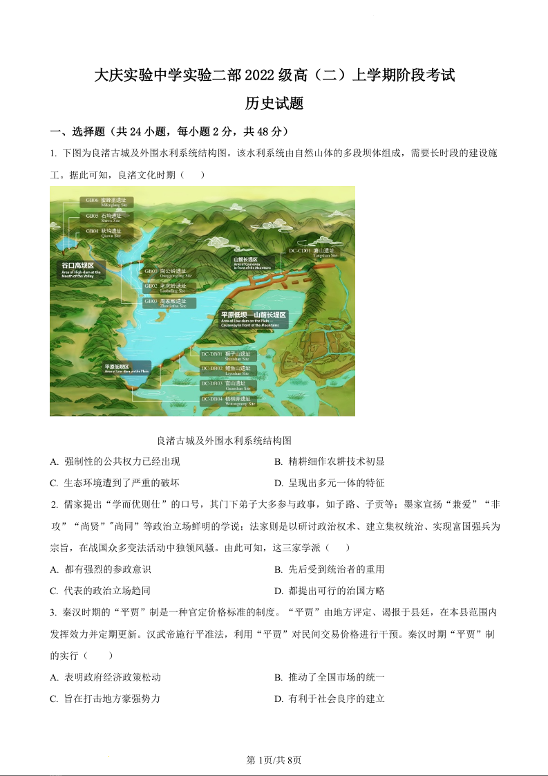 黑龙江省大庆实验中学二部2023-2024学年高二上学期10月阶段性考试历史(原卷版)