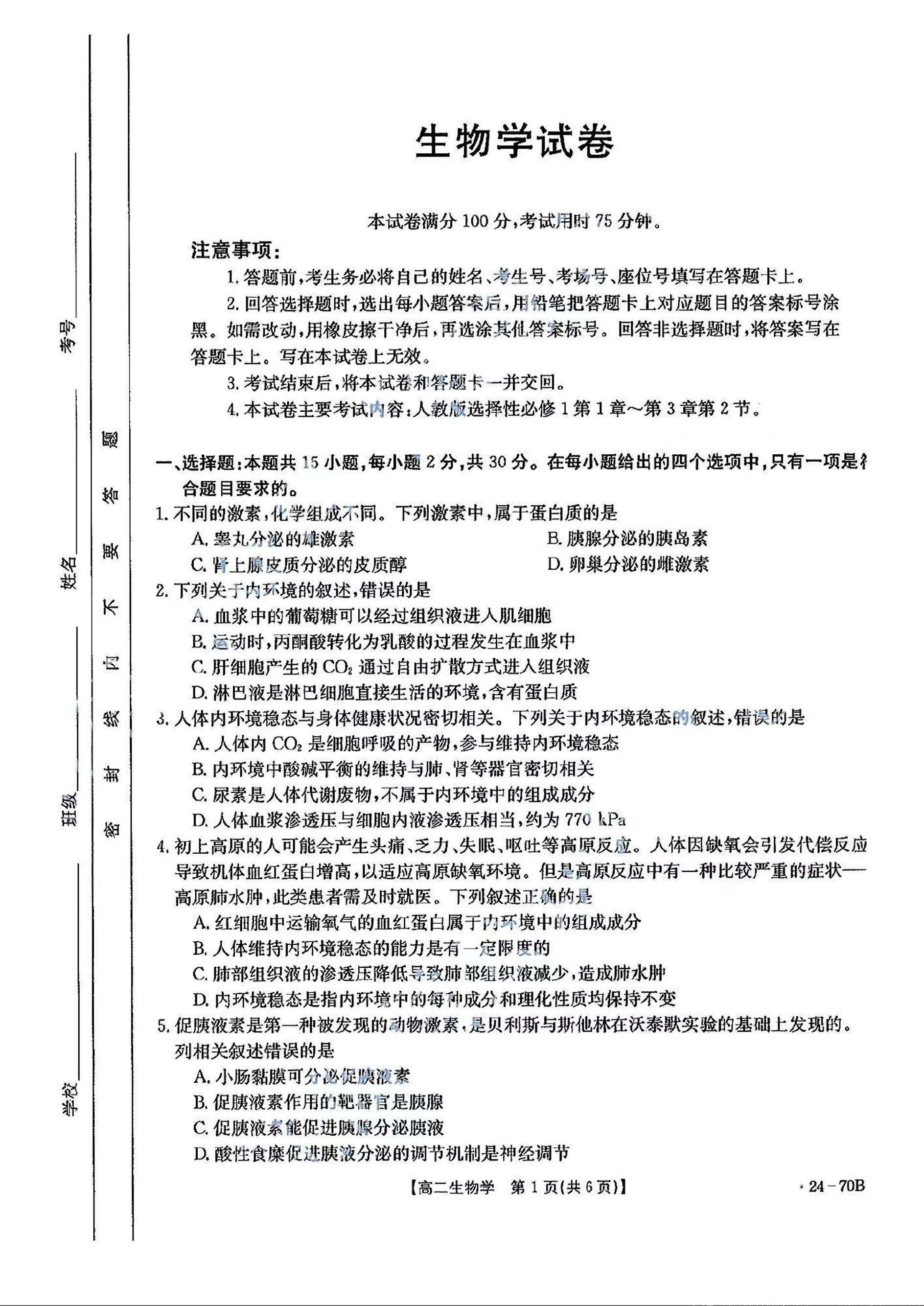 吉林省部分名校2023-2024学年高二上学期10月联考生物+答案
