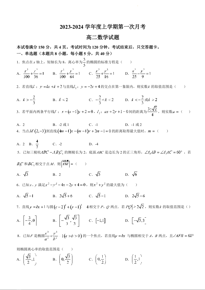 吉林省四校联考2023-2024学年高二上学期10月月考数学+答案