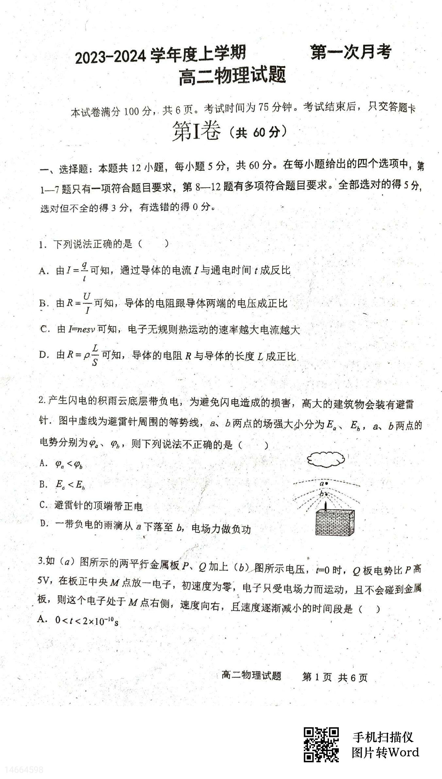 吉林省四校联考2023-2024学年高二上学期10月月考物理+答案