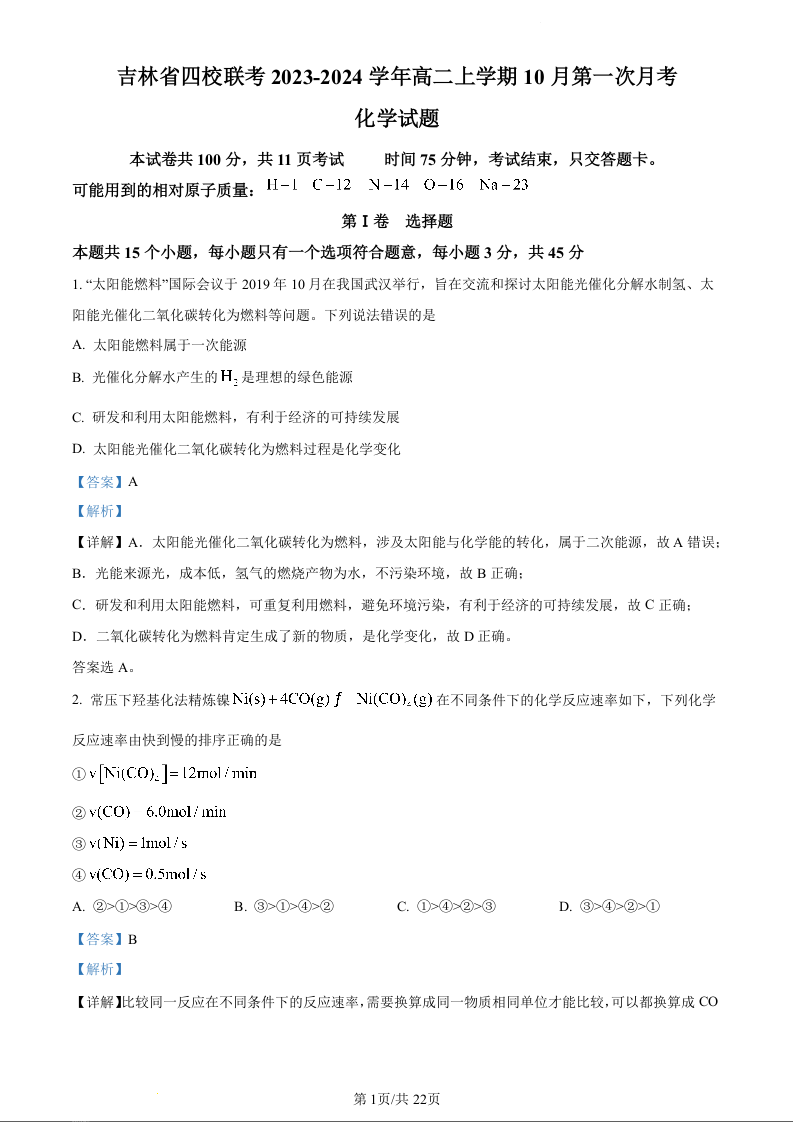 吉林省四校联考2023-2024学年高二上学期10月月考化学(精品解析版)