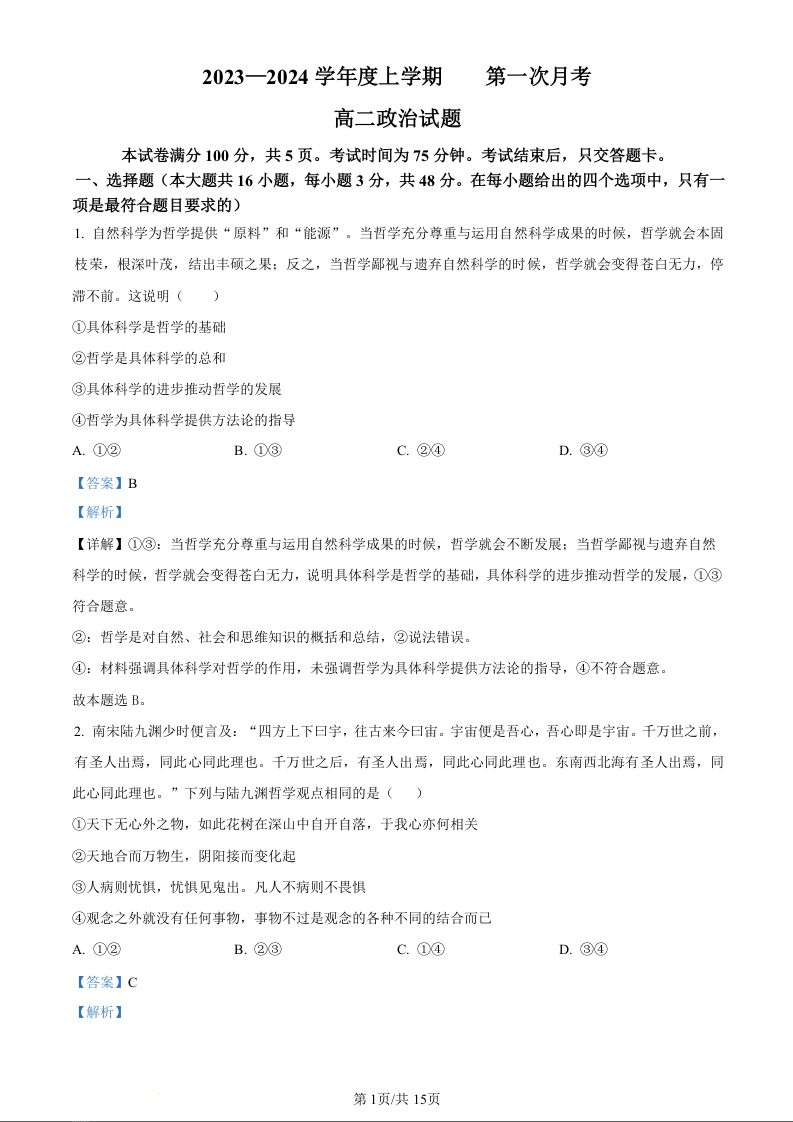 吉林省四校联考2023-2024学年高二上学期10月月考政治(精品解析版)