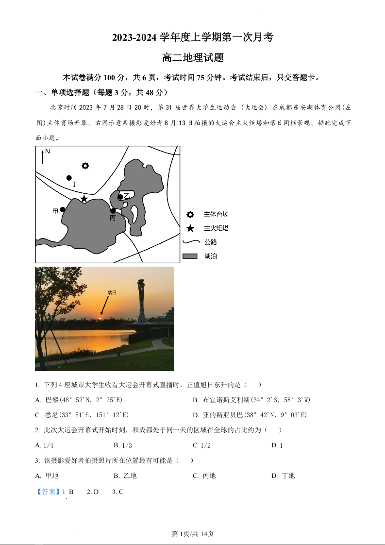 吉林省四校联考2023-2024学年高二上学期10月月考地理(精品解析版)