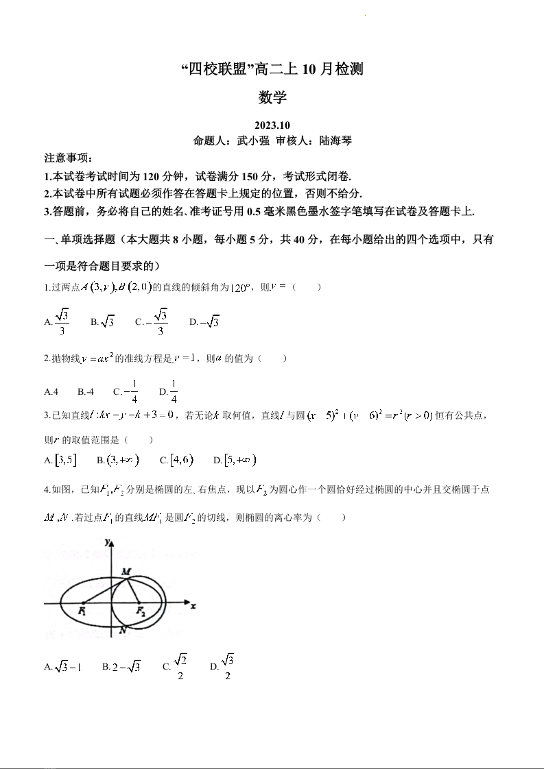 江苏省南京人民中学、南通海安市实验中学2023-2024学年高二上学期第一次月考数学