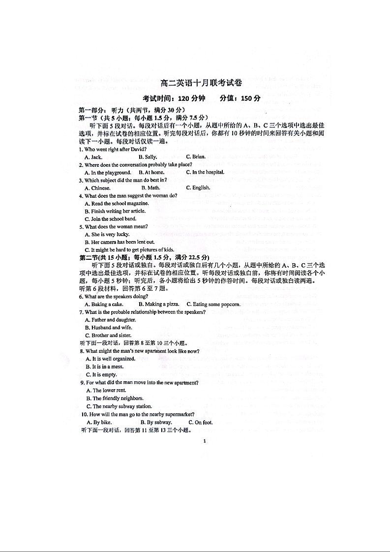 江苏省南京人民中学、南通海安市实验中学2023-2024学年高二上学期第一次月考英语