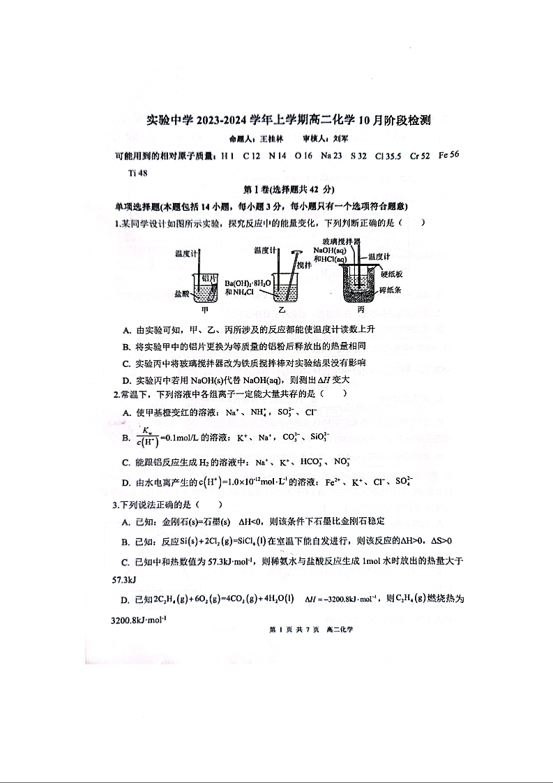 江苏省南京人民中学、南通海安市实验中学2023-2024学年高二上学期第一次月考化学