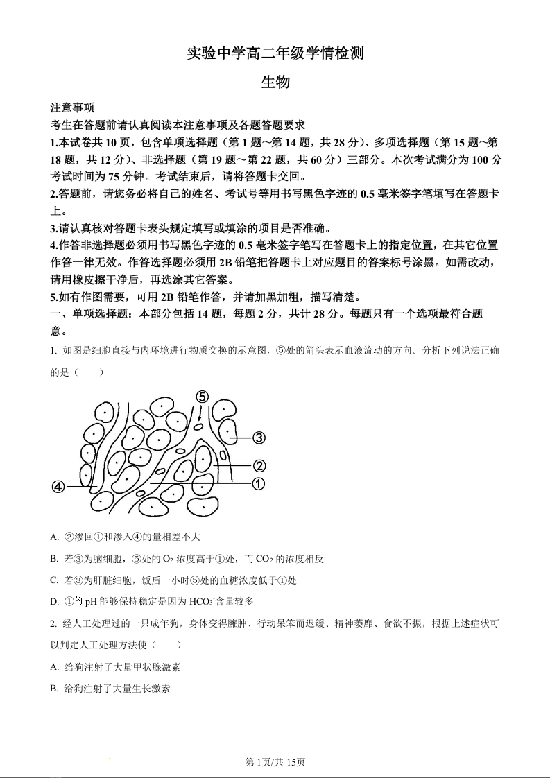 江苏省南京人民中学、南通海安市实验中学2023-2024学年高二上学期第一次月考生物(原卷版)