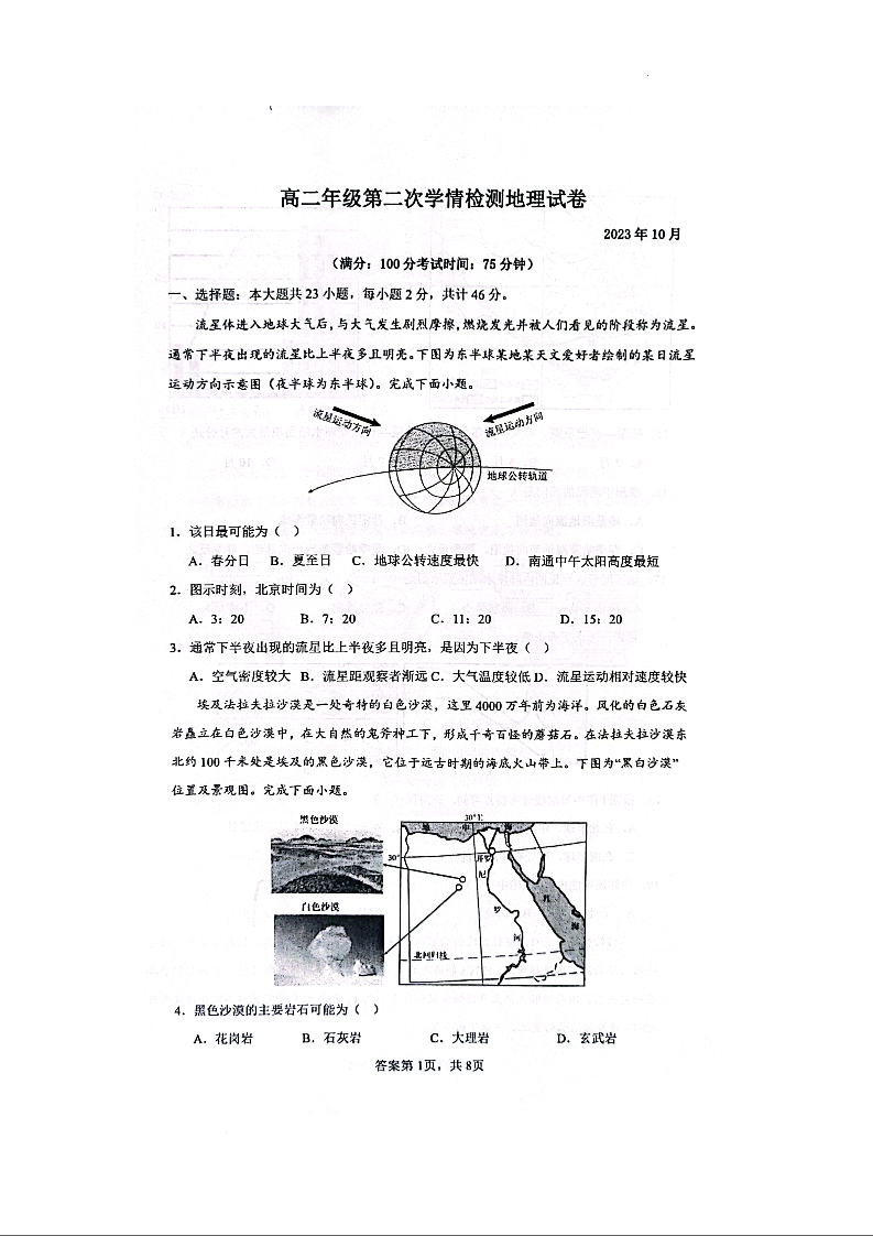 江苏省南京人民中学、南通海安市实验中学2023-2024学年高二上学期第一次月考地理