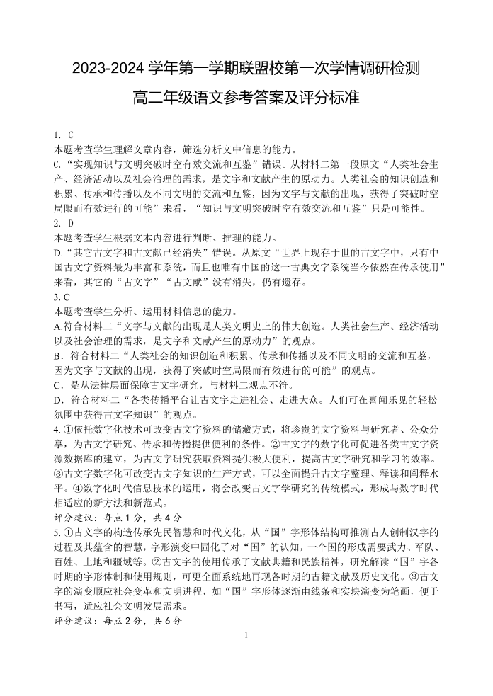 江苏省盐城市五校联考2023-2024学年高二上学期10月月考语文答案