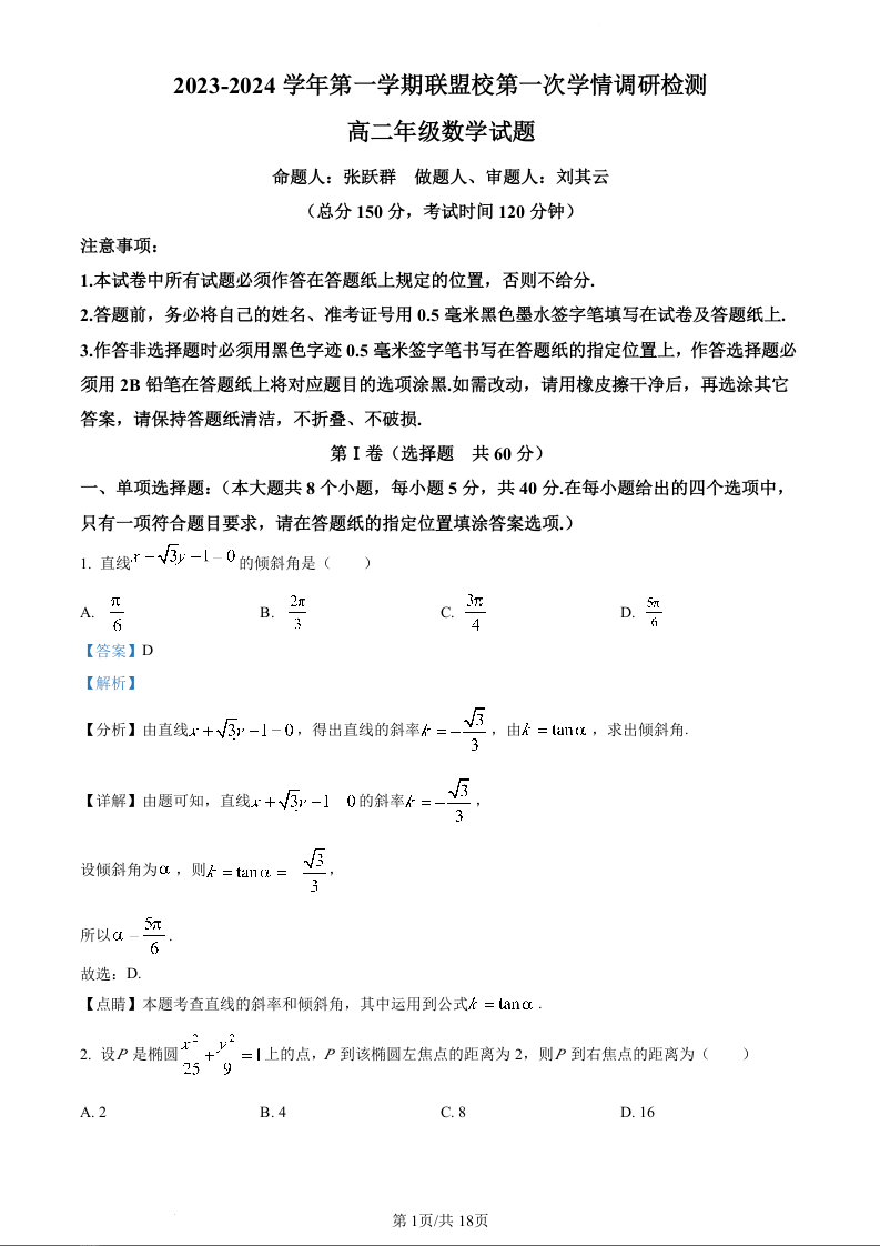 江苏省盐城市五校联考2023-2024学年高二上学期10月月考数学(精品解析版)