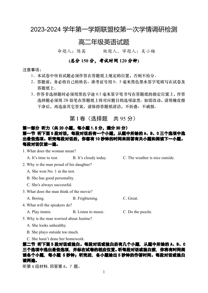 江苏省盐城市五校联考2023-2024学年高二上学期10月月考英语